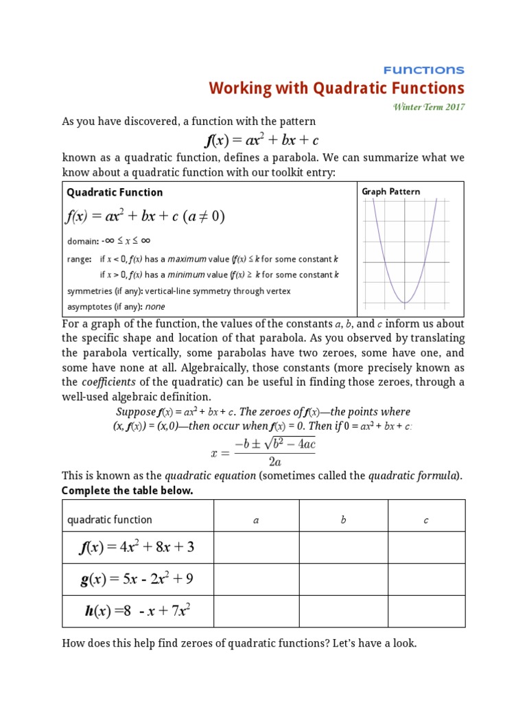 Workingwithquadraticfunctionsw2017 Quadratic Equation